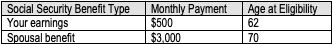 A surviving spouse does not wait till her FRA to claim her own benefits ($1,000/month) but begins to collect at age 62. Her benefits will be reduced to $700 per month based on retiring before her FRA.2 When age 67 is reached, the widow may switch to collecting 100% of her surviving spouse’s Social Security benefits – which is $3,000/month. She cannot receive both her own and her spouse’s benefits.