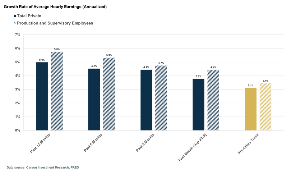 The good news is several private measures of prices, including rents and used cars, are already decelerating. We believe it will just be a matter of time before this shows up in the official inflation data. It is a race of sorts — how quickly the inflation data can reverse before the economy starts to weaken in the face of tight monetary policy. For now, every additional month in which the economy and employment remain resilient buys more time for the official inflation data to decline. And to that end, September payroll data was positive in more ways than one.